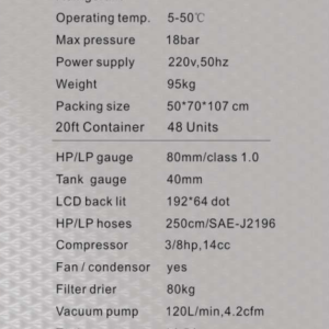 Thông số kỹ thuật Máy nạp gas điều hoà tự động Zell AC1000